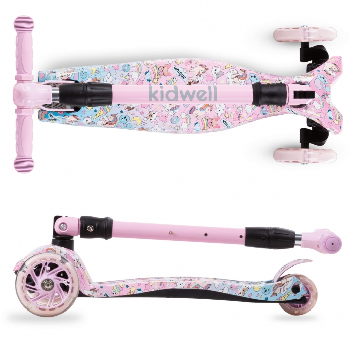 Structura durabila, usoara, cantarind 2.7 kg.  Platforma larga de pe rotile din fata ajuta la mentinerea echilibrului. Rotile silentioase si durabile asigura o aderenta foarte buna la sol. Luminile LED incorporate in roti care stralucesc in timpul conducerii. Suspensie fata cu puntea de directie dinamica, sistem de piere rapid. Ghidon din aluminiu cu reglare pe 3 cai a inaltimii.